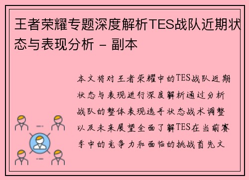 本文将围绕和平精英BLG战队的状态展开深入分析,并对其未来发展进行展望。在开篇部分,我们将简要概述战队在近期比赛中的表现,关注其团队合作、选手状态、战术运用等方面。接着,文章将从四个主要方面进行详细探讨。首先,我们会分析BLG战队的当前竞技状态,其次是团队内部的配合与沟通,再者是战术策略的调整,最后...